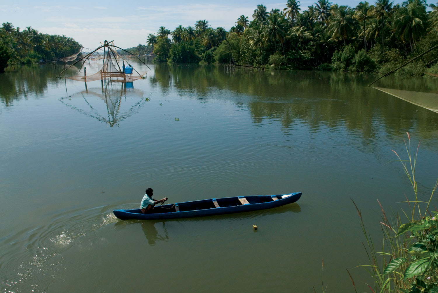 Experience authentic village life on today’s half-day Village Life Tour, showcasing community-based tourism. Glide through narrow canals on a country boat operated by locals, observing everyday activities like fishing, paddy farming, and weaving. Try traditional fishing methods, stroll through village paths to visit an Anganwadi school, and watch artisans at work on crafts like screw pine weaving and snake boat models. In the afternoon, indulge in a rejuvenating full-body Ayurveda massage. Overnight at the Coconut Lagoon.